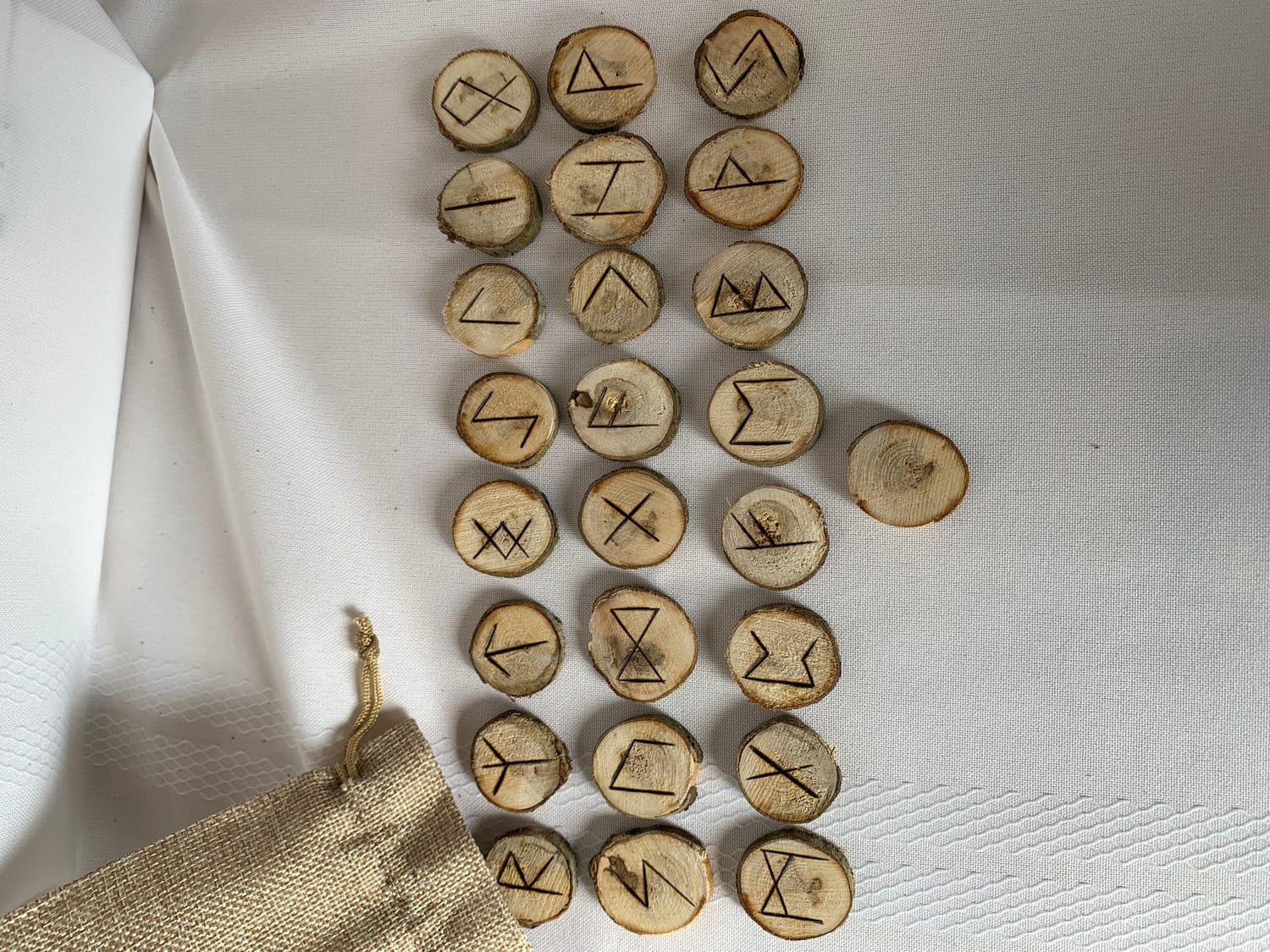 Chaque pièce est unique et diffère d'un jeu à l'autre selon les essences d'arbre utilisées (Hêtre, Érable, Frêne). Idéal pour ceux qui souhaitent faire des tirages runiques.
