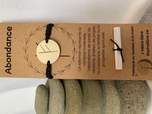 de couleur naturelle est brodé à la main en spirale, de grandeur ajustable et runes burinées avec passion sur tranches de bois. À porter dans toutes les occasions ou suspendre dans un endroit idéal pour que vous viviez l'abondance.
