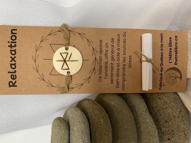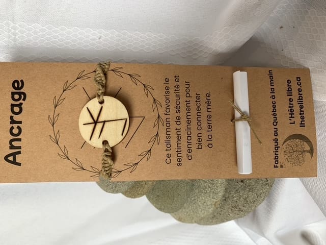 de couleur naturelle est brodé à la main en spirale, de grandeur ajustable et runes burinées avec passion sur plaquette de bois. À porter dans toutes les occasions et ressentir un sentiment de bien-être.