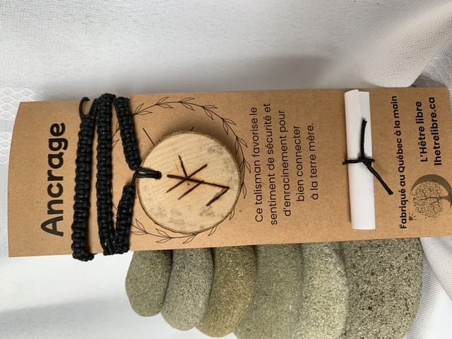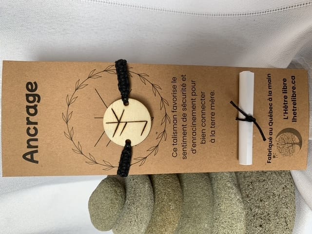 de couleur noire est brodé à la main en format plat, de grandeur ajustable et runes burinées avec passion sur tranches de bois. À porter dans toutes les occasions ou suspendre dans un endroit idéal pour que vous puissiez vous ancrer.
