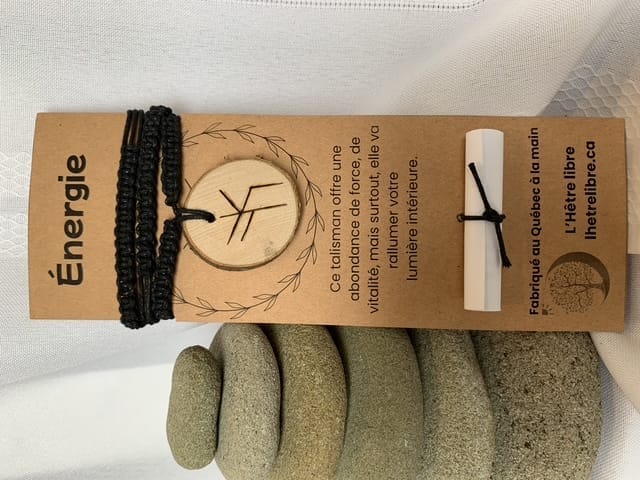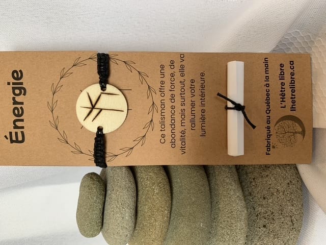 de couleur noire est brodé à la main en format plat, de grandeur ajustable et runes burinées avec passion sur tranches de bois. À porter dans toutes les occasions ou suspendre dans un endroit idéal pour une vitalité infinie.