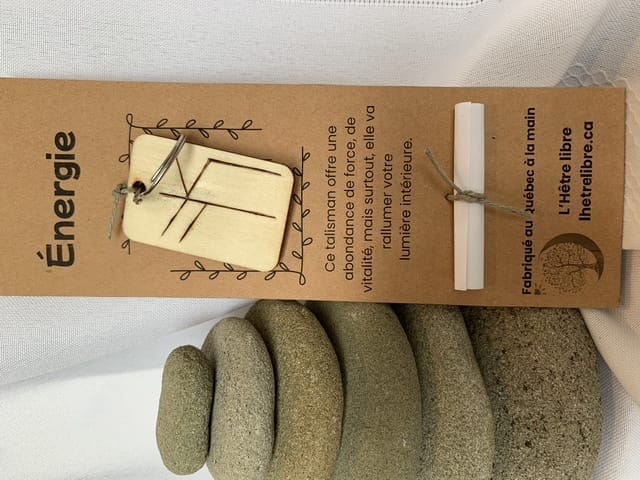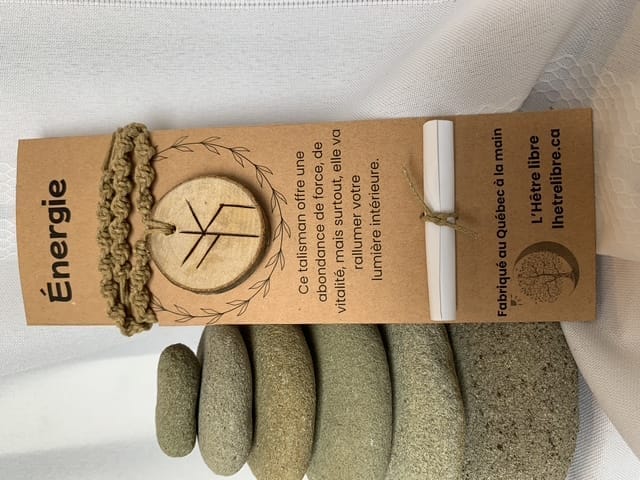 de couleur naturelle est brodé à la main en spirale, de grandeur ajustable et runes burinées avec passion sur tranches de bois. À porter dans toutes les occasions ou suspendre dans un endroit idéal et vivre dans la positivité et la lumière.