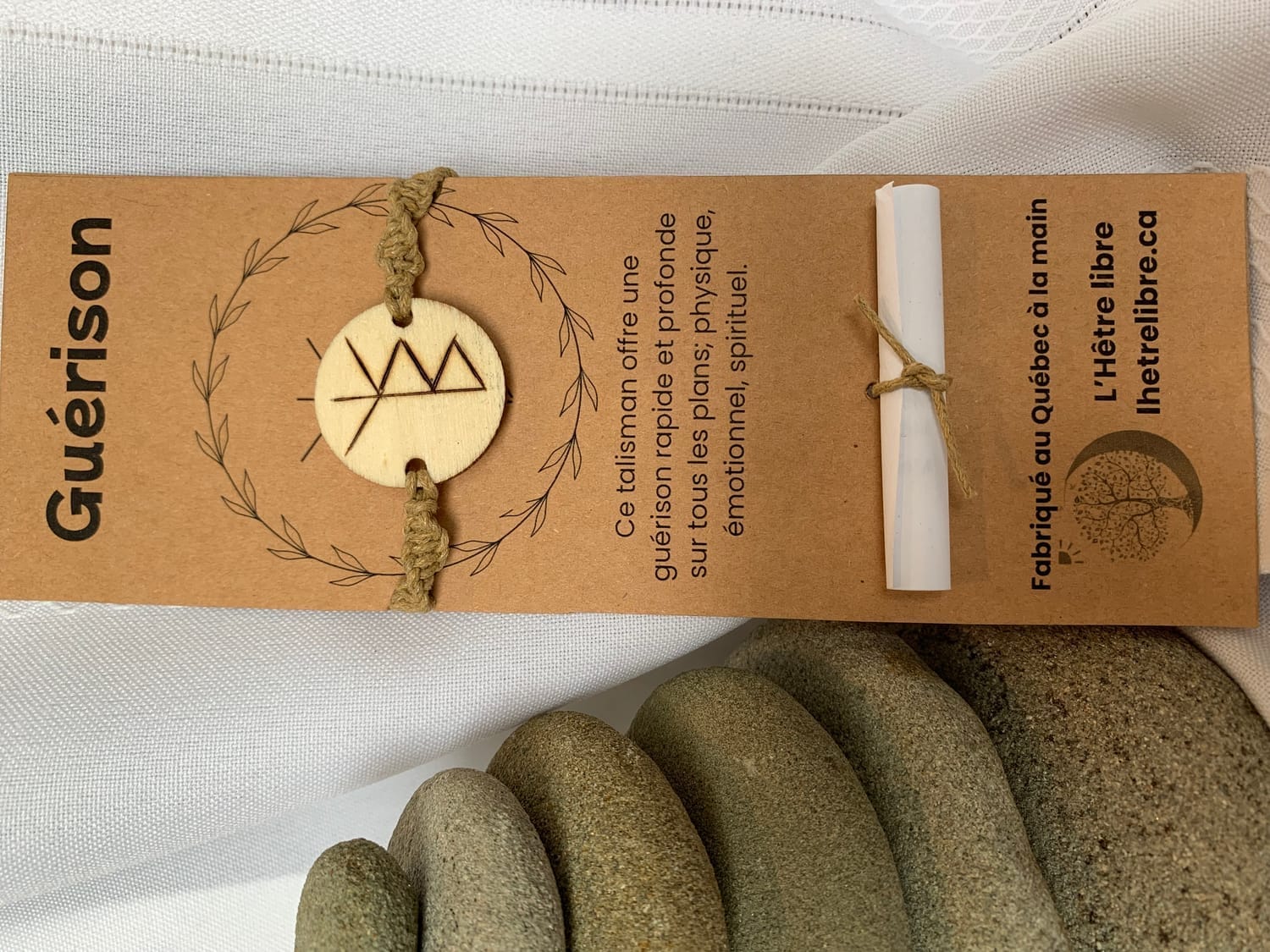 de couleur naturelle est brodé à la main en spirale, de grandeur ajustable et runes burinées avec passion sur plaquette de bois. À porter dans toutes les occasions pour vivre une guérison complète et rapide.