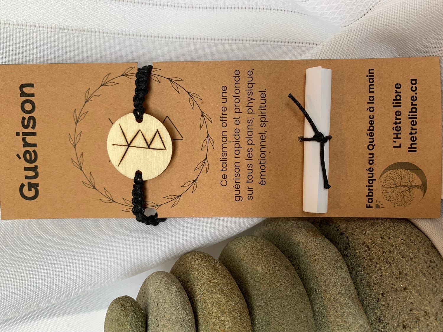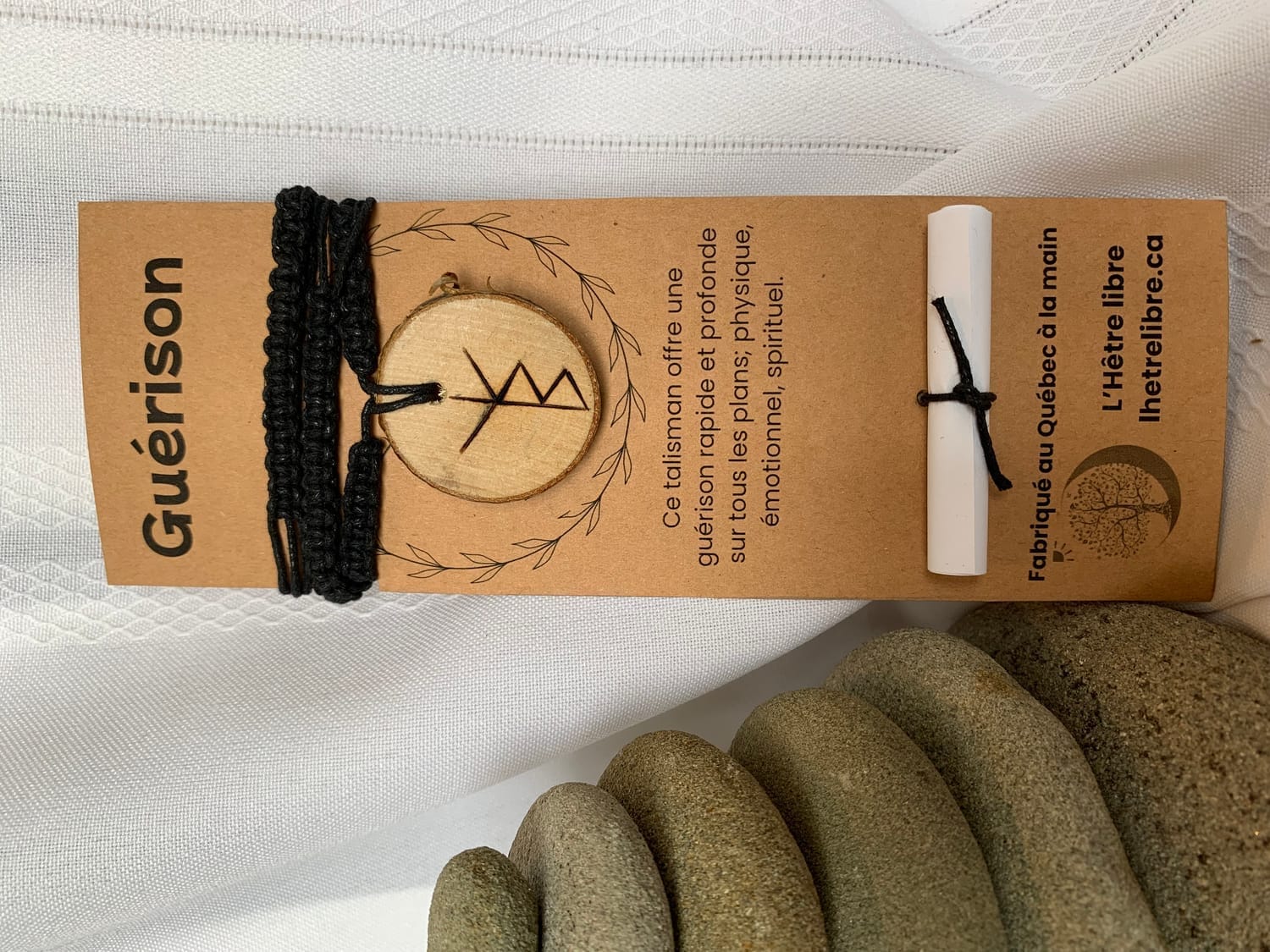 de couleur noire est brodé à la main en format plat, de grandeur ajustable et runes burinées avec passion sur plaquette de bois. À porter dans toutes les occasions pour vivre une guérison complète et rapide.