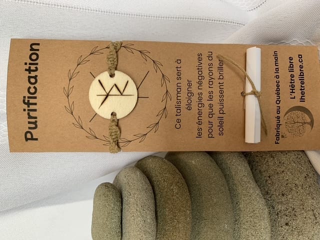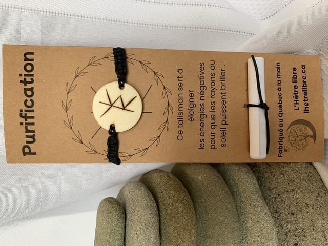 de couleur naturelle est brodé à la main en spirale, de grandeur ajustable et runes burinées avec passion sur plaquette de bois. À porter dans toutes les occasions pour vivre dans la positivité et la lumière.