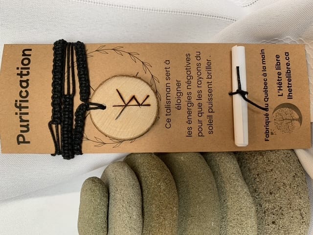 de couleur noire est brodé à la main en format plat, de grandeur ajustable et runes burinées avec passion sur tranches de bois. À porter dans toutes les occasions ou suspendre dans un endroit idéal et vivre dans la positivité et la lumière.