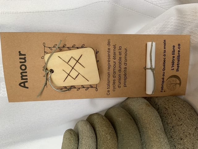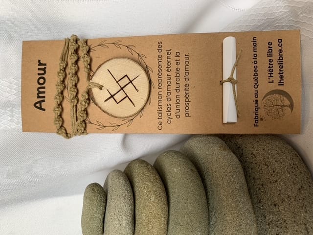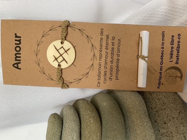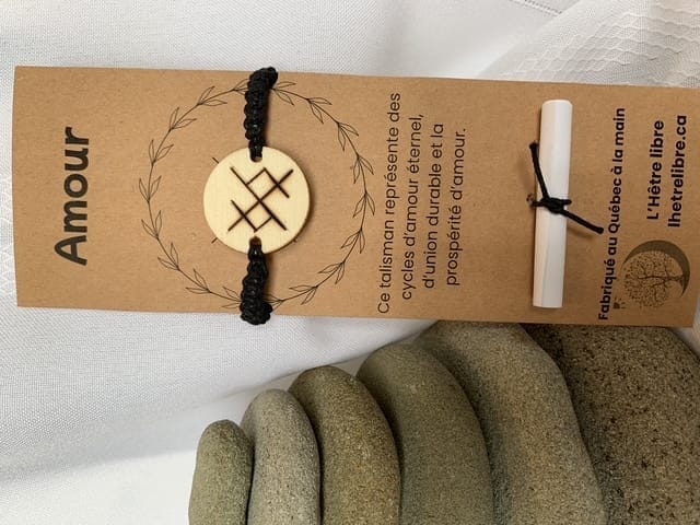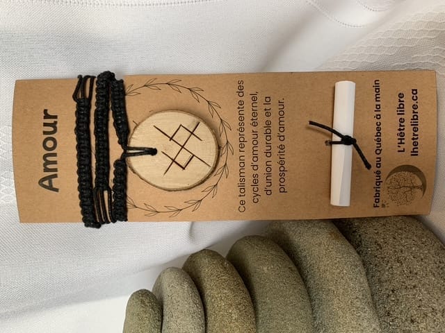de couleur noire est brodé à la main en format plat, de grandeur ajustable et runes burinées avec passion sur tranches de bois. À porter dans toutes les occasions ou suspendre dans un endroit idéal pour que l'amour jaillisse.