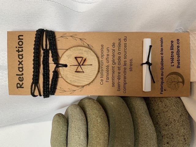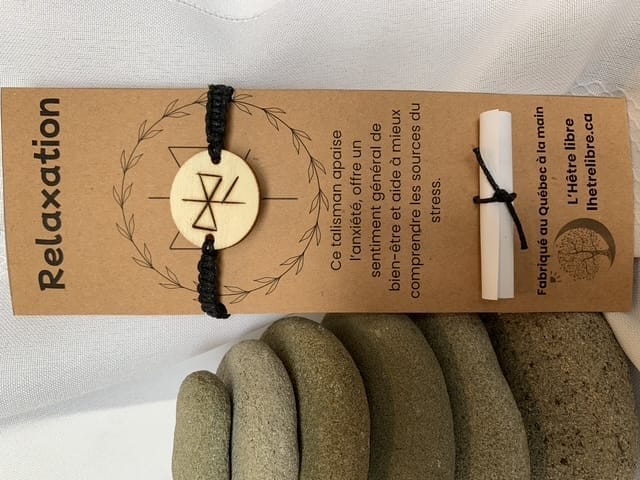 de couleur noire est brodé à la main en format plat, de grandeur ajustable et runes burinées avec passion sur tranches de bois. À porter dans toutes les occasions ou suspendre dans un endroit idéal pour calmer votre esprit.