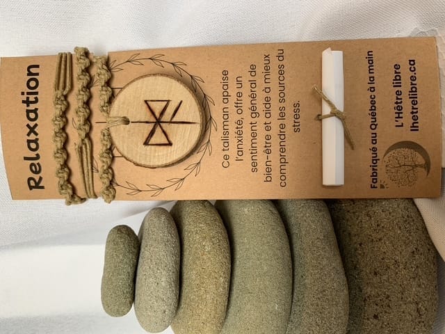 de couleur naturelle est brodé à la main en spirale, de grandeur ajustable et runes burinées avec passion sur tranches de bois. À porter dans toutes les occasions ou suspendre dans un endroit idéal pour calmer votre esprit.